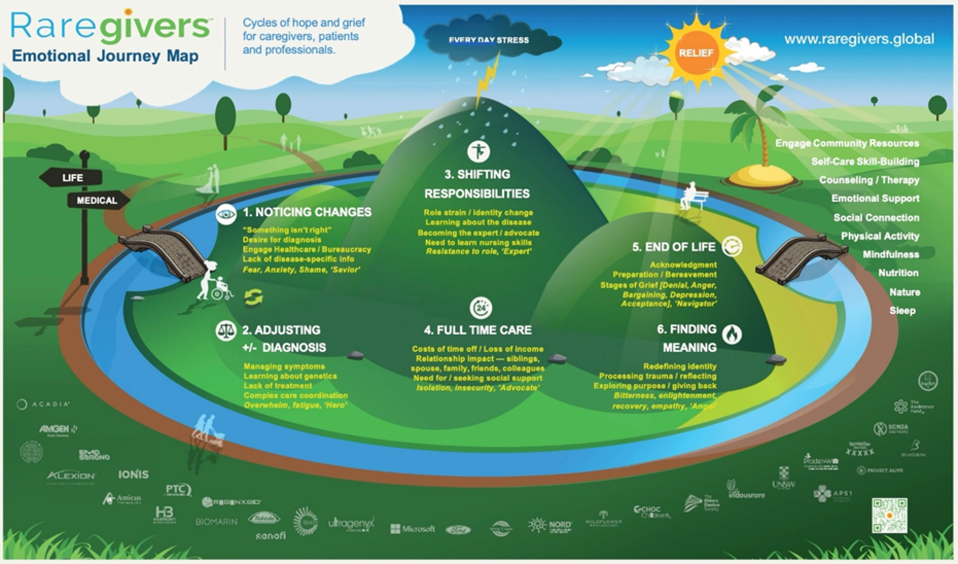 As people, we have an incredible ability to hold both hope and grief in our hearts, this is the Yin and Yang of living with medical complexity. It is estimated that 350 million families globally experience 10,000+ genetically identified rare diseases. Every person across this support system is in some phase of emotional crisis. The stages of grief – denial, anger, bargaining, depression, acceptance, finding meaning – are all present but often go unrecognized. To help start the conversation, the Raregivers Coalition created a research-backed tool and released it as a free, downloadable resource in 15 languages. Raregiver Emotional Journey Map visualizes these stages as a remote island with various landmarks: noticing changes in a loved one, adjusting with or without diagnosis, shifting family responsibilities, realities of full-time care, worry about end-of-life experiences, and finding meaning. These experiences can be isolating, but embracing our emotions also creates space to help us off this island with resources, self-care and social connection, all things we aim to provide through Raregivers.